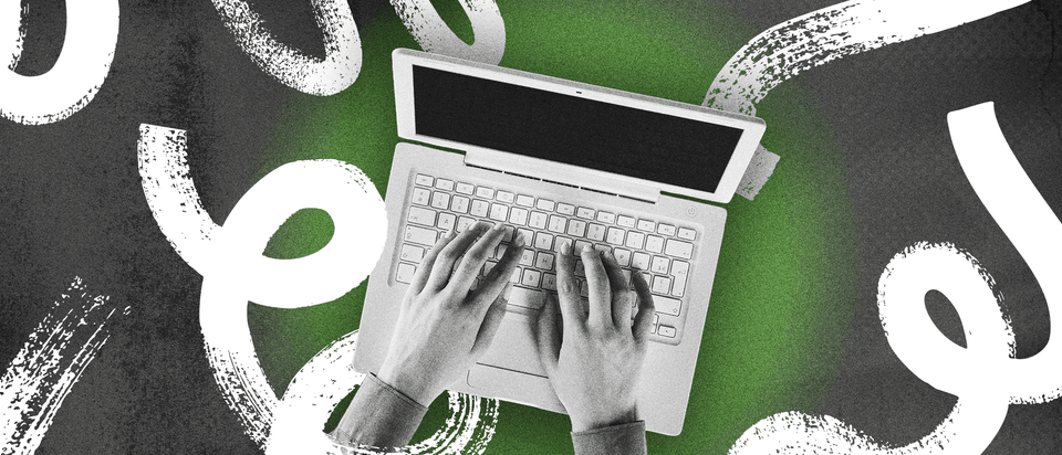 A green and black graphic with binary and html code.